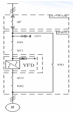 KM3、分KM1、KM2、為工頻模式。電機可由QF直接啟停并進(jìn)行保護,變頻器可完全和電網(wǎng)脫離。