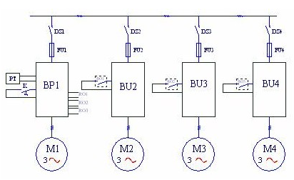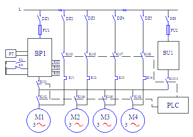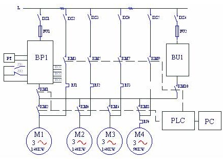 圖中:BP1—變頻器;BU2~BU4--軟起動(dòng)器,PT—壓力變送器。由圖一可見(jiàn),變頻器連接在第一臺水泵電機上,需要加泵或減泵時(shí),由變頻器RO1~RO3端口輸出信號起動(dòng)或停止其他的水泵,這時(shí)水泵的起動(dòng)采用自耦降壓起動(dòng)裝置或軟起動(dòng)器。這種方案的特點(diǎn)是水泵電機不需要在變頻和工頻之間切換;第一臺水泵永遠連接在變頻器上,沒(méi)有切換過(guò)程中的失壓現象;由于變頻泵以外的泵都有軟起動(dòng)器,所以不需要再做備用系統,當變頻器故障時(shí),可用軟起動(dòng)器手動(dòng)起動(dòng)M2~M4水泵,保證供水不致中斷;每臺電機都有起動(dòng)器,初始投資較大。另一種是“循環(huán)投切”方案,系統圖如圖二所示