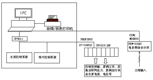 為保證系統的可靠性,上位機PC用于管理,用組態(tài)軟件做出若干工藝流程圖,實(shí)時(shí)顯示系統的運行狀況,并統計歷史數據,如需要可隨時(shí)打印報表;還用于故障的報警和處理。PC機為研華工業(yè)計算機,PLC為西門(mén)子S-7300,便于與總控室計算機聯(lián)網(wǎng),采用帶有PROFIBUS接口的CPU315。CP5611是通信模塊,PDM-820AC電參數綜合分析儀用于檢測系統的用電量??刂扑玫钠?停,切換,閥的啟/閉;電機電流,溫度的檢測,水泵使用時(shí)間的統計;壓力,流量,水質(zhì)參數的采集等,均由PLC完成。水壓的給定值由變頻器鍵盤(pán)設定。