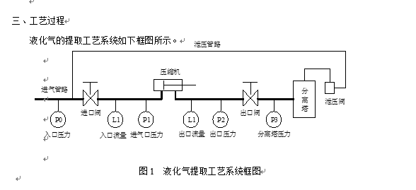 煉油產(chǎn)生的氣體,經(jīng)過(guò)壓縮機加壓后凝為液態(tài)進(jìn)入分離塔,經(jīng)過(guò)吸收等其他加工工藝,提取出石油液化氣。進(jìn)氣口壓力P1要求小于0.6MPa,壓縮機出口壓力P2可達到1.2MPa~1.7MPa之間,經(jīng)出口閥調節后保證分離塔壓力P3在1.05MPa。如果某種原因使分離塔壓力升高,為安全起見(jiàn)則泄壓閥打開(kāi),將分離塔內液體經(jīng)管道回流進(jìn)氣口。